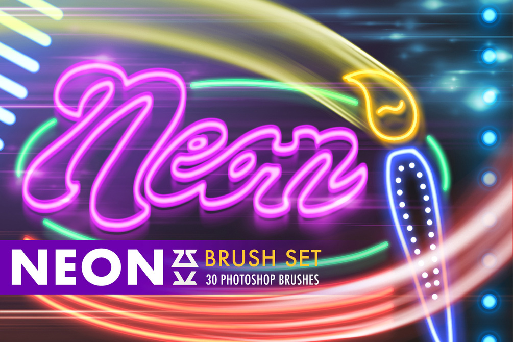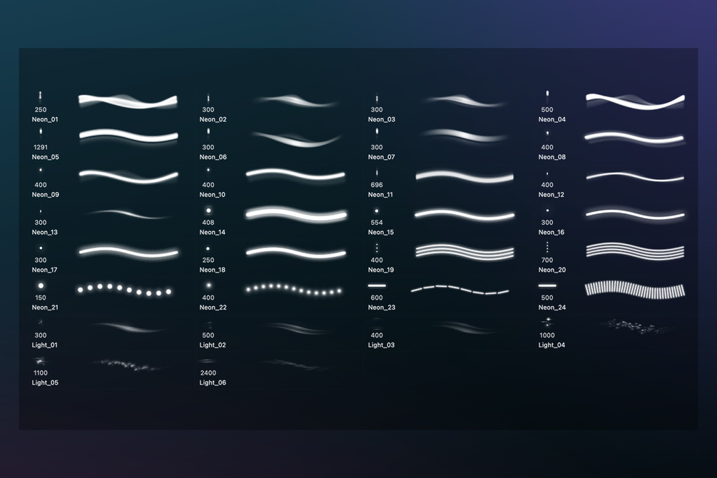 PLEASE NOTE: The brushes are not glowing by default. To get the glow effect please check the “Neon_Layer_Effect.psd” file if you're using Photoshop.